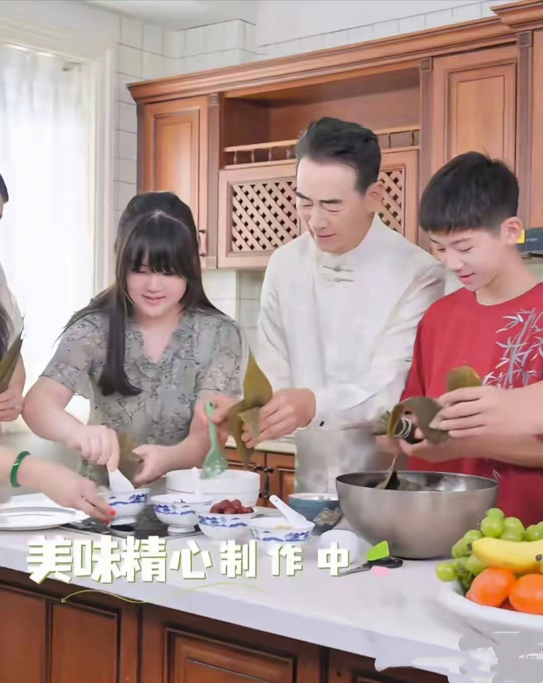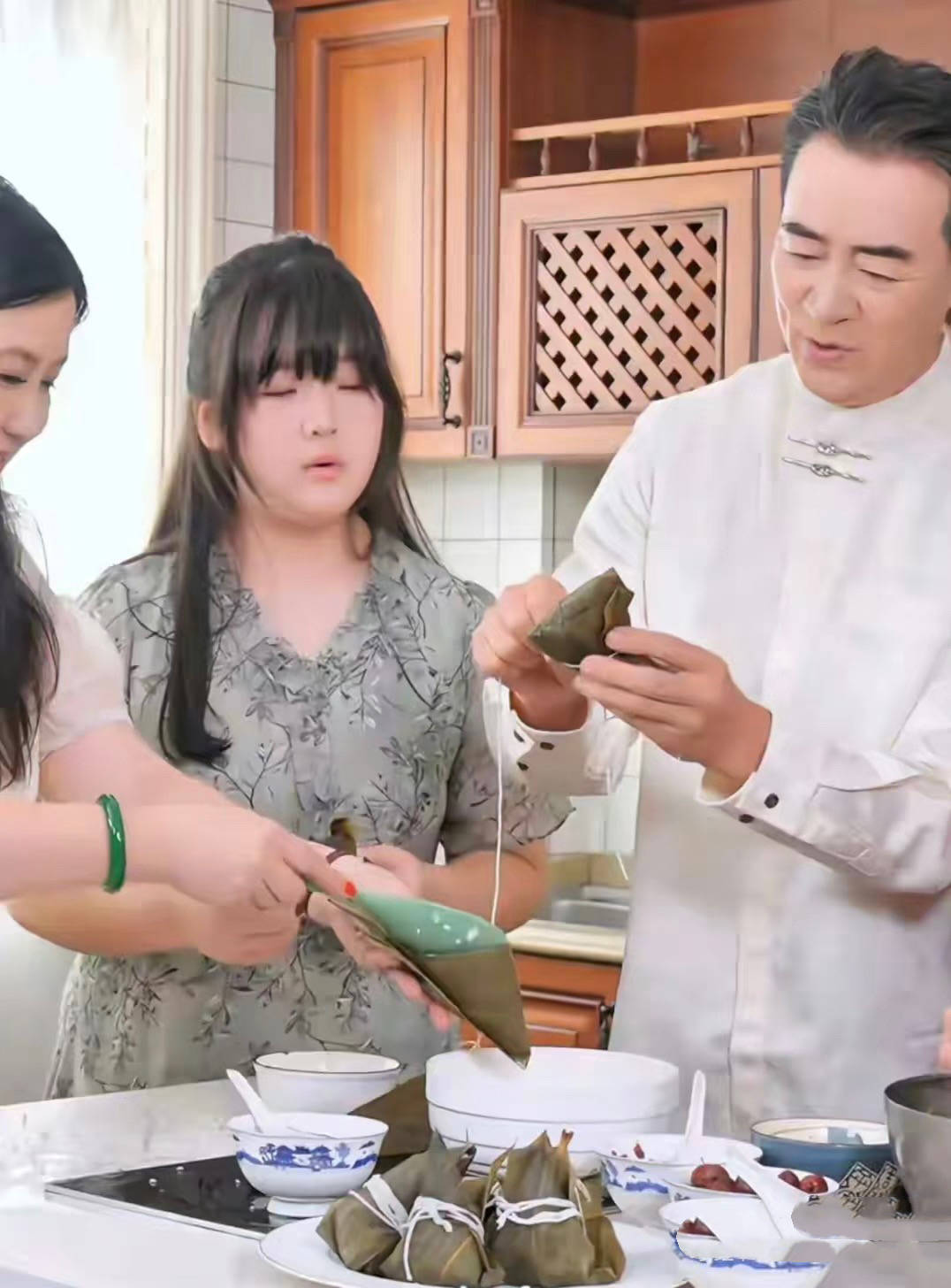 寇振海会亲自教孩子们包粽子,他认真的用线绑好粽子,女儿学的很认真。妻子也在一旁帮忙,李婷手上戴着翡翠镯子,一看就价值不菲。