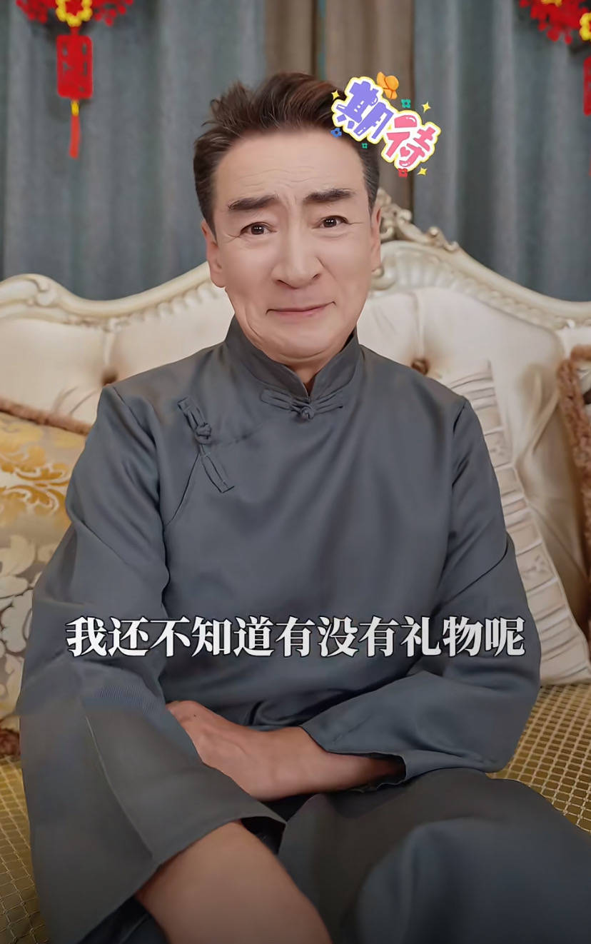 穿上长袍,还是剧中的形象,但额上的皱纹更深了,眼神也没有那么凌厉,满是老父亲的温柔。