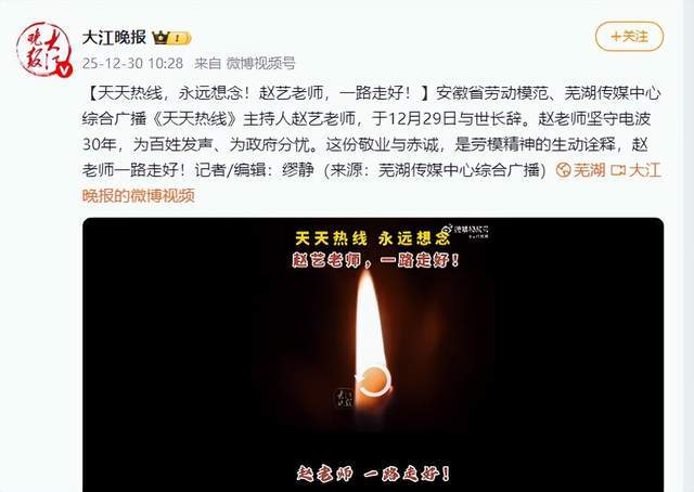 12月30号,多位来自安徽芜湖的网友突发透露悲痛消息,另外当地的媒体也有报道此事,曾给诸多网友带来电台记忆的《天天热线》主持人赵艺不幸因病去世,年仅60岁。