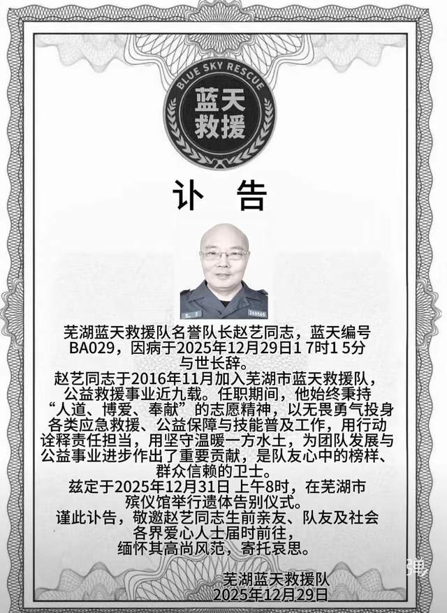 芜湖当地的蓝天救援队公开了相关的讣告,并透露,31号早八点将会在当地的殡仪馆为其举行追悼会。