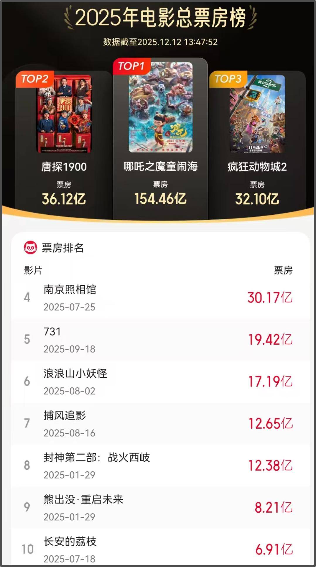 2025年的春节档电影《哪吒之魔童闹海》凭借总票房154亿登顶中国影史总票房冠军,全球影史票房榜第5,也是全球影史票房前十中,唯一一部中国影片,这含金量不必多说。