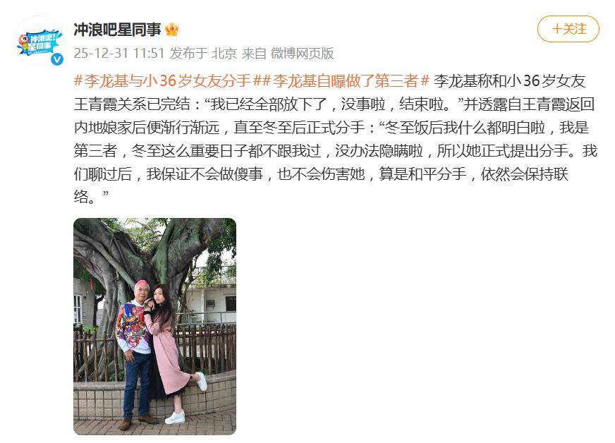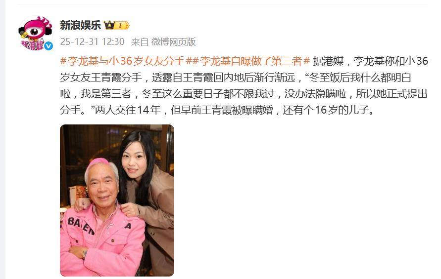 一句“冬至饭后我什么都明白啦,我是第三者”,让75岁香港艺人李龙基与小36岁女友王青霞(Chris)长达14年的“爷孙恋”,在2025年的最后一天以一场狗血剧的方式