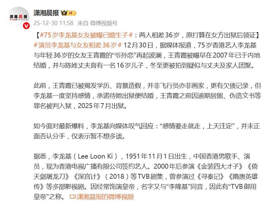 一句“冬至饭后我什么都明白啦,我是第三者”,让75岁香港艺人李龙基与小36岁女友王青霞(Chris)长达14年的“爷孙恋”,在2025年的最后一天以一场狗血剧的方式仓促落幕。这场恋情不仅因年龄差吸足眼球,更因女方被爆出“隐婚16年且有子”的连环猛料,让围观网友直呼“剧本都不敢这么写”。