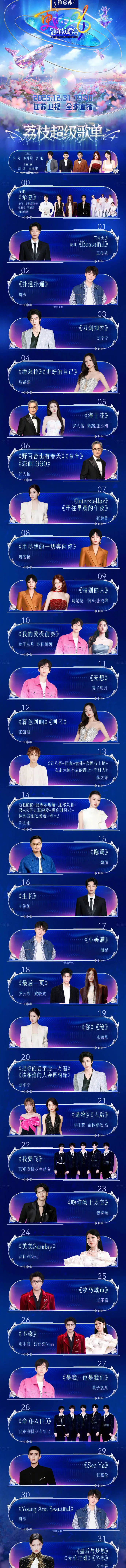 2026江苏卫视跨年演唱会发布全阵容海报!其中李宇春压轴登场,罗大佑、刘宇宁、王俊凯、张韶涵、周笔畅、周深、罗云熙、毛不易、欧阳娜娜、任嘉伦、单依纯、沈佳润、TOP登陆