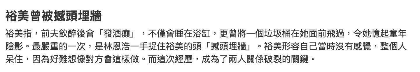 裕美会有此底线,源自她与前夫有一段不愉快的婚姻关系。裕美受访时罕谈了与前夫的一段婚姻关系。她表示自小父母分开,反而让她对婚姻生活格外向往,22岁就打算结婚,所以很积极地恋爱,直到25岁认识了同为教友的前夫,火速踏入婚姻殿堂。结婚之后,才发现两人的人生的经历相差太多,价值观完全不在一条线上。由于前夫从小就是在教会长大,接触社会不多,又没怎么工作,所以令她觉得与对方在一起像带孩子一样。而最让她受不了的是,前夫会发酒疯,最严重的一次,将她的头撞向墙壁,她认为这是家暴,自此之后两人关系破裂,再加上前夫对自己的母亲非常不尊重,最后结婚三年离婚收场。