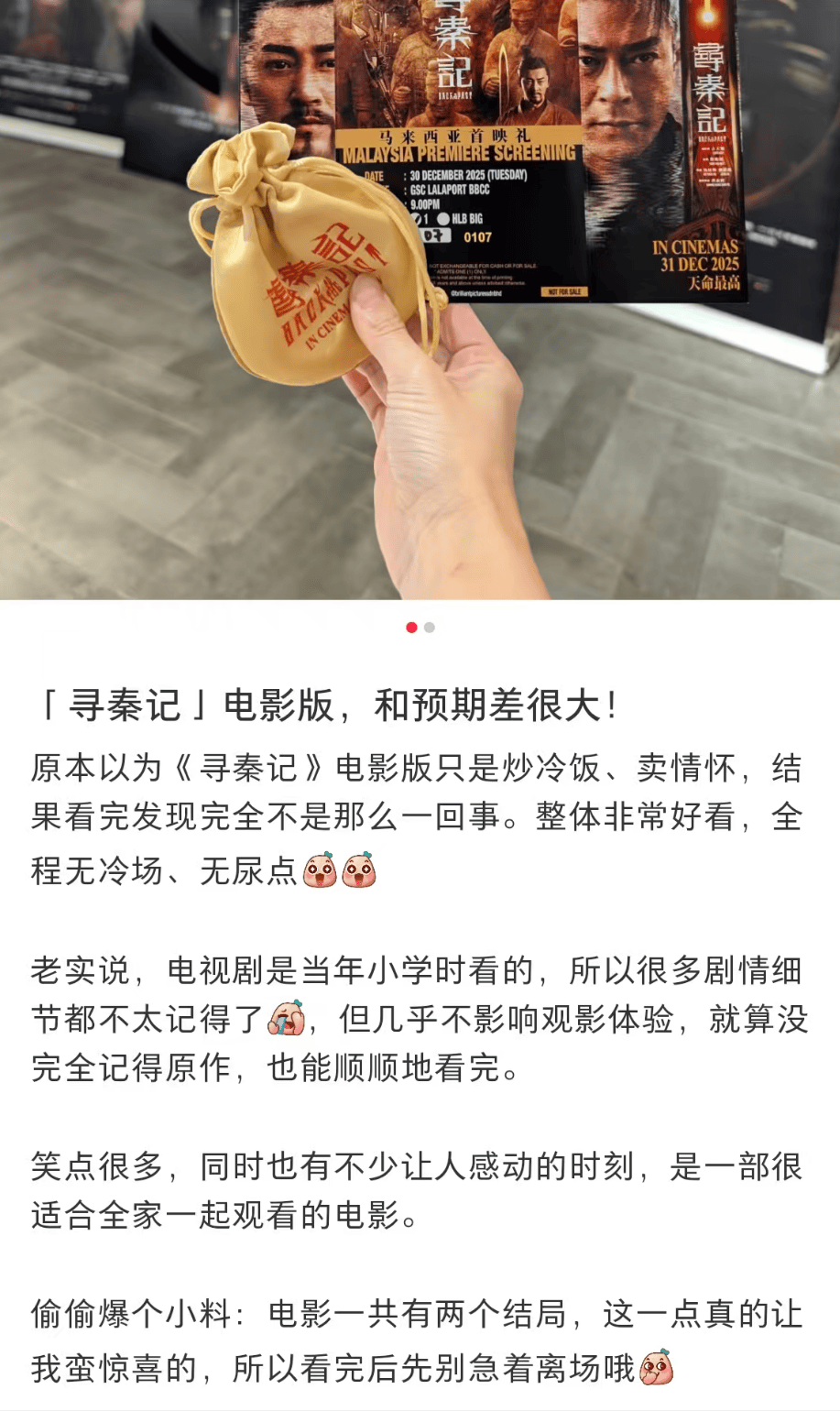 小某书上也有一波评论,都比较积极正面,比如有网友坦言“原本以为《寻秦记》电影版是炒冷饭、卖情怀”,结果看完“整体非常好看,全程无冷场、无尿点,笑点很多。”同时她还提醒网友,电影一共有两个结局,看完后先别急着离场。