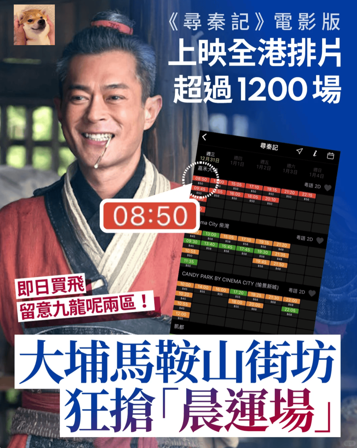 而香港上一次有这样港产片在上映日场次“密过巴士班次”的奇迹还是《破·地狱》,当时《破·地狱》全天放映超过1000场(整个香港),而寻秦记12月31日排片超过1200场,远远超过《破·地狱》首日场次,相信《寻秦记》会成为爆款,甚至有望创造首日票房破1000万的奇迹。