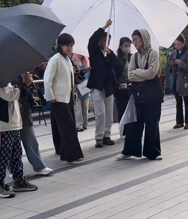 孙俪裹着一件灰扑扑的浅棕色羽绒服,搭配老气的黑裤子,站在街边跟助理唠嗑。