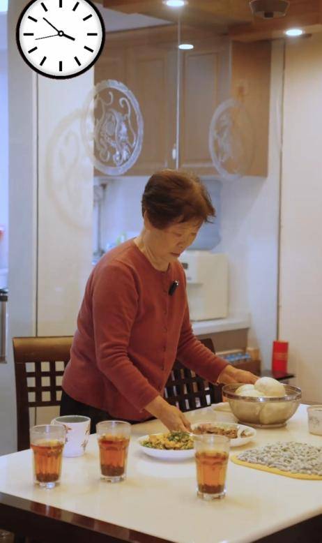 等饭做好了,爸爸赶紧去厨房帮着端饭,腿脚利索、脾气也好,一家三口其乐融融的,场面很温馨。而且老两口都80多岁了,胃口还很不错,都能吃一大碗,比孙浩盛的都多。