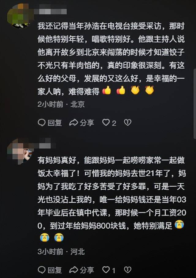 有网友感慨说:人到中年还有父母陪伴,这才是幸福的家。孙浩57岁了还能跟爸妈撒娇,喊一声“妈妈”“爸爸”,这才是人生最大的福气!