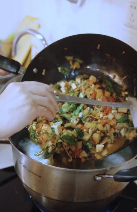把这些配菜丢到锅里炒,看着也是五颜六色的很好看,等炒出汁后,再另外起锅烧水,里面放上姜片,用来煮搓好的面剂子。