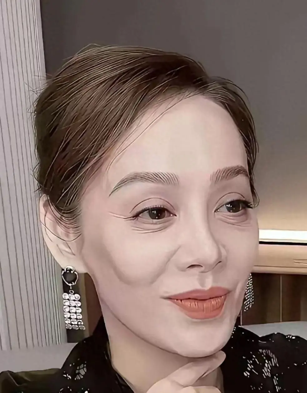 她在剧中的皮肤状态都是已经磨皮的状态,但还是能隐隐看出她脸上岁月的痕迹,可想而知她线下的样子。