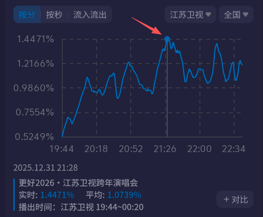 往年江苏台跨晚收视都能轻松破1.5%,如今最高点卡在了1.4%。