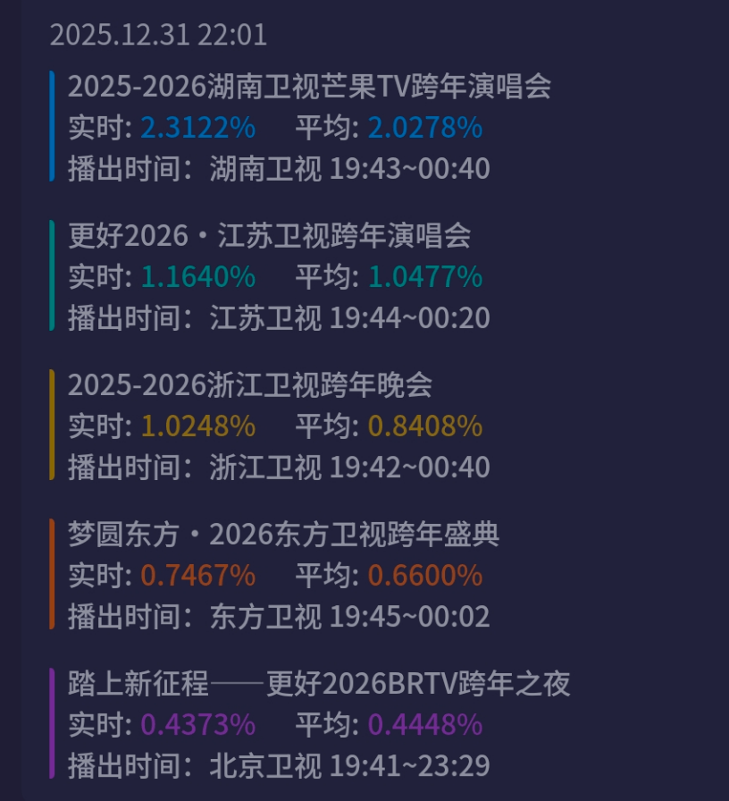 从启航2026央视跨年晚会,到湖南台、江苏台、浙江台、东方台、北京台跨年晚会,六大跨晚可谓各有看点,经历了多年风格调整,已然形成了固定受众,收视率也是一年比一年稳定。