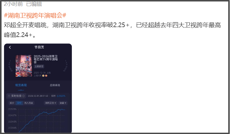 湖南台:广告中发现少量真唱,最高点破2.45%