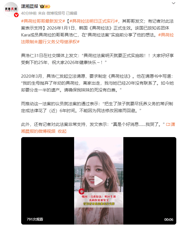 (来源:潇湘晨报)2026年1月1日,韩国《具荷拉法》正式生效。该国已故知名团体Kara成员具荷拉的哥哥具浩仁,在“具荷拉法案”实施前分享了他的想法。具浩仁31日在社交媒