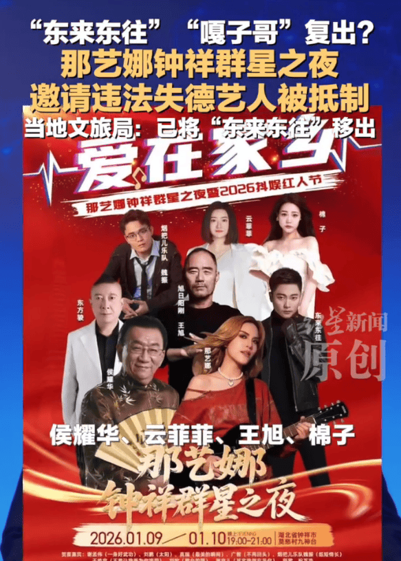 近日,网红那艺娜钟祥群星之夜邀请涉毒艺人被抵制,搜索票务平台发现,那艺娜作为该演出的领军人,主办方还邀请了侯耀华、云菲菲、王旭、棉子、东来东往等艺人参加活动。此外,演出海报还显示贺喜嘉宾包括谢孟伟。