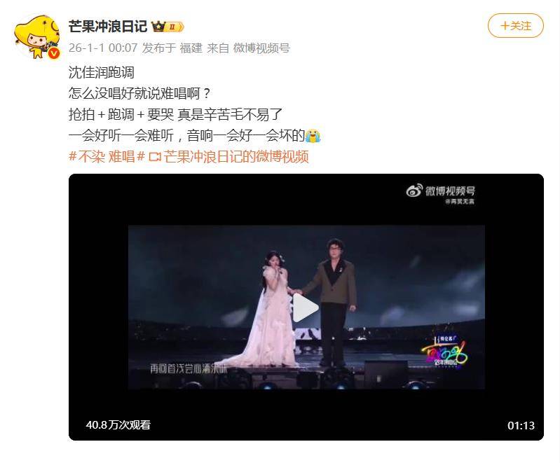 但也有部分声音认为,对于首次登上跨年直播舞台的年轻艺人而言,面对全开麦、无垫音的严苛条件,加之与前辈合作的巨大压力,紧张失误情有可原。在“假唱”盛行的环境下,坚持真唱的态度本身值得肯定。支持者指出,沈佳润此前个人舞台表现稳定,音色亦有辨识度,应当给予新人成长的机会。