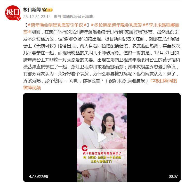 据12月31日晚间报道,刚刚过去的跨年狂欢夜,火药味似乎比节日味还浓。当零点的钟声被明星夫妻的亲密互动抢了风头,一场关于“舞台分寸”与“观众体验”的争论,在网络上彻底炸开了锅。