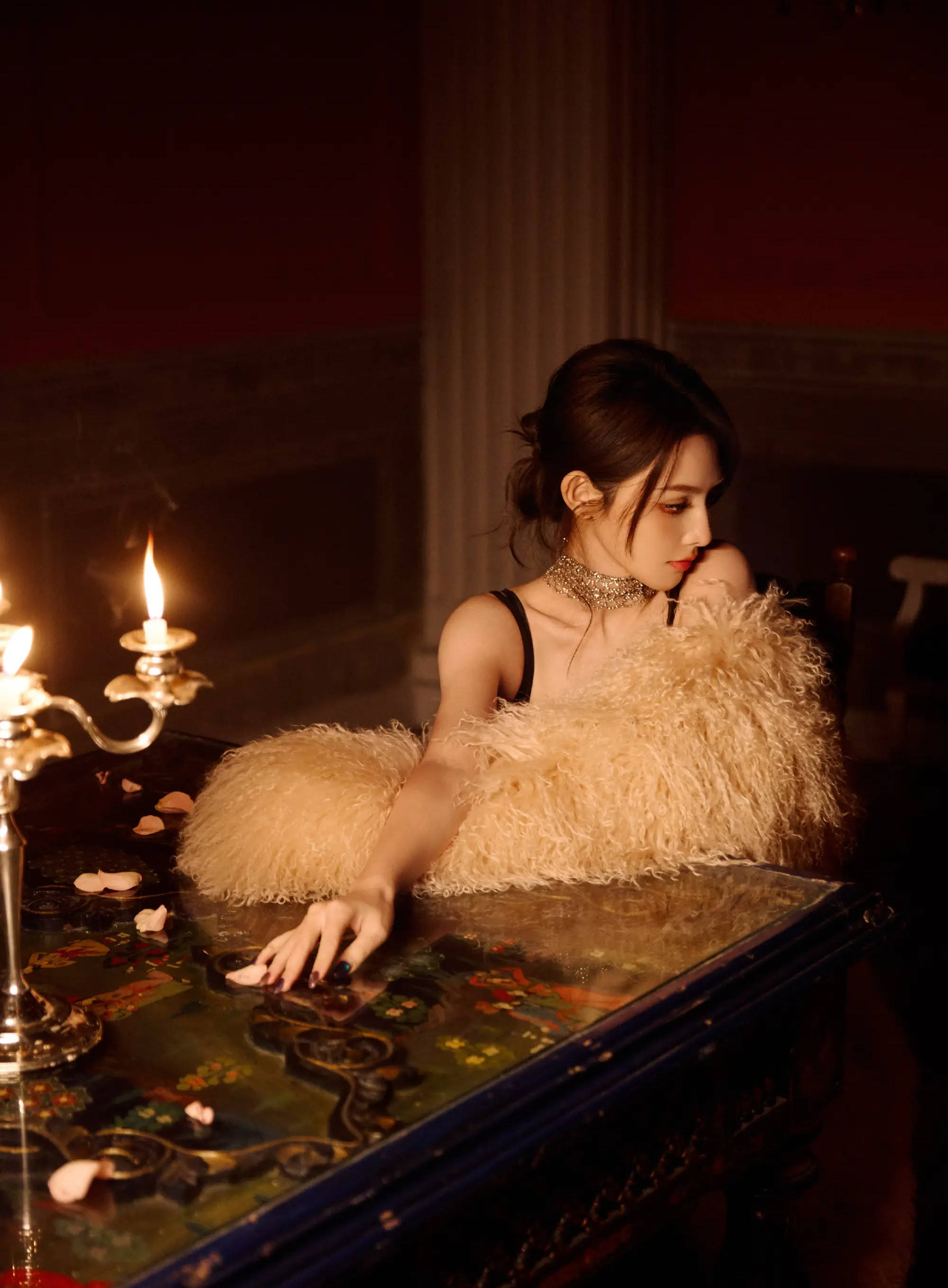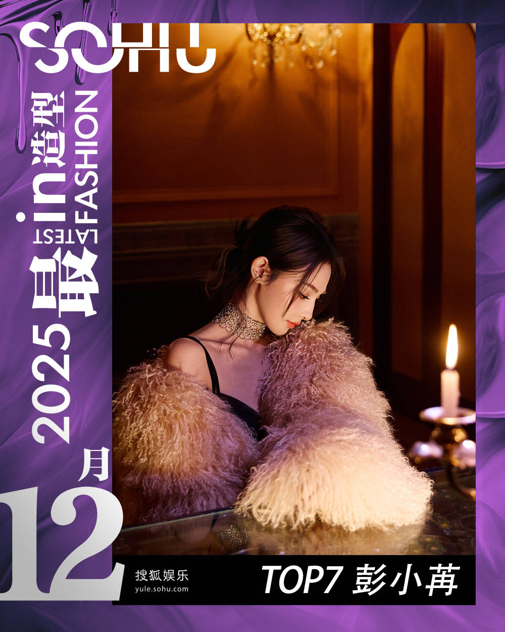 是古堡名媛,也是烛影里的驼绒玫瑰~彭小苒穿着裸色皮草,真的不要太奢华。松散的毛绒匹配卷曲的碎发,破碎感中混杂着妩媚,丛生出优雅的娇柔。内搭的黑色丝质礼裙,流淌着微微珠光,不去争抢颈间淬了暖意的璀璨。半透明的氤氲,成了困住人心的烟雾,扩散出不真实的疏离感,仿若她制造的神秘梦境。