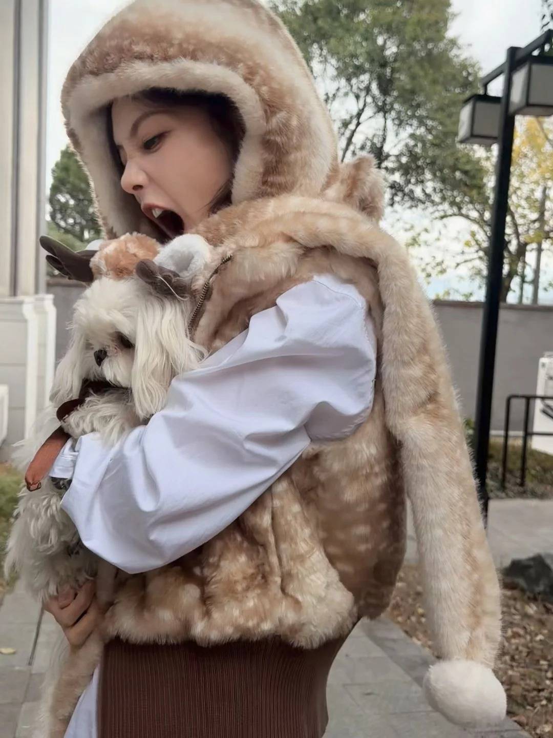李一桐的毛绒穿搭也太治愈了吧,围巾、帽子、小马甲,所有的升温buff都在她身上啦。白色的衬衣,铺垫出干净的底色,显得绒墩墩的小鹿纹马甲格外可爱。围巾尾端坠着的毛球,随着她的步伐一颠一颠,萌感直击心巴。对着镜头,她时不时做出搞怪表情,童心驱散了清冷和肃穆,抱着“肉宝”欢快散步,不得不说也算是冬日里最惬意的享受。