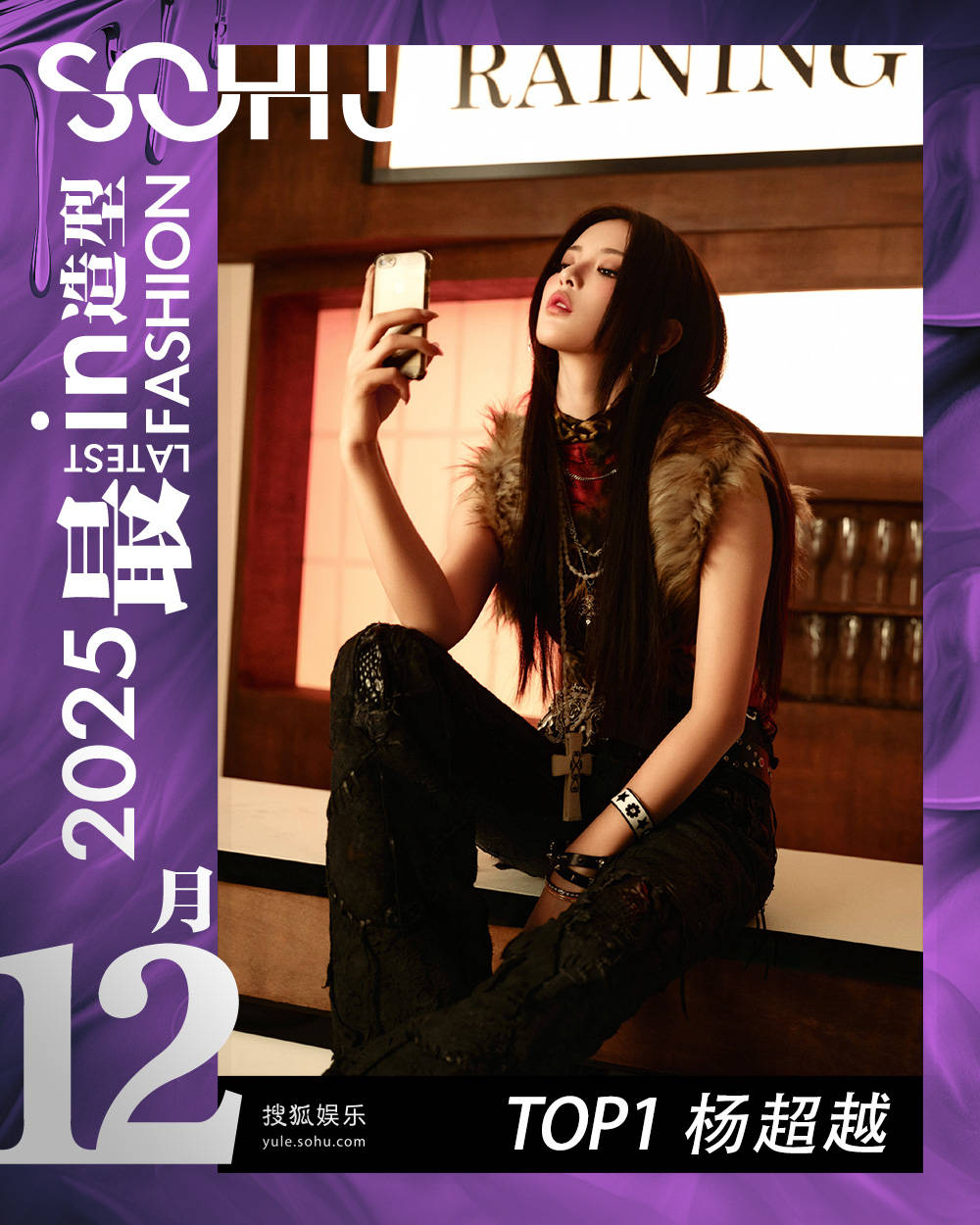 杨超越这身造型,绝对是野性与柔绒的惊艳碰撞。无袖的棕褐色坎肩,带着蓬松的慵懒气息,边缘蜷曲的毛丝,好似裹着一层糖浆,不仅衬托出流畅的双臂线条,还带来一丝甜辣。内搭的红色格子打底,复古张力拉满,一条粗犷的贝壳十字架项链,摇晃在胸前,强烈的街头感中夹杂着一份自然野性。破洞的水洗黑裤和超宽金属花朵腰带搭配,反差之美在每一处细节中悄然升级。手腕上叠戴一堆铆钉腕饰,不羁的气息扑面而来,让人无法忽视。利落的长发扫在胸前,烟熏妆被墨镜遮挡,她指尖轻抵唇畔,似若有若无挑逗着什么,一股张扬的时髦感几乎要冲破屏幕。