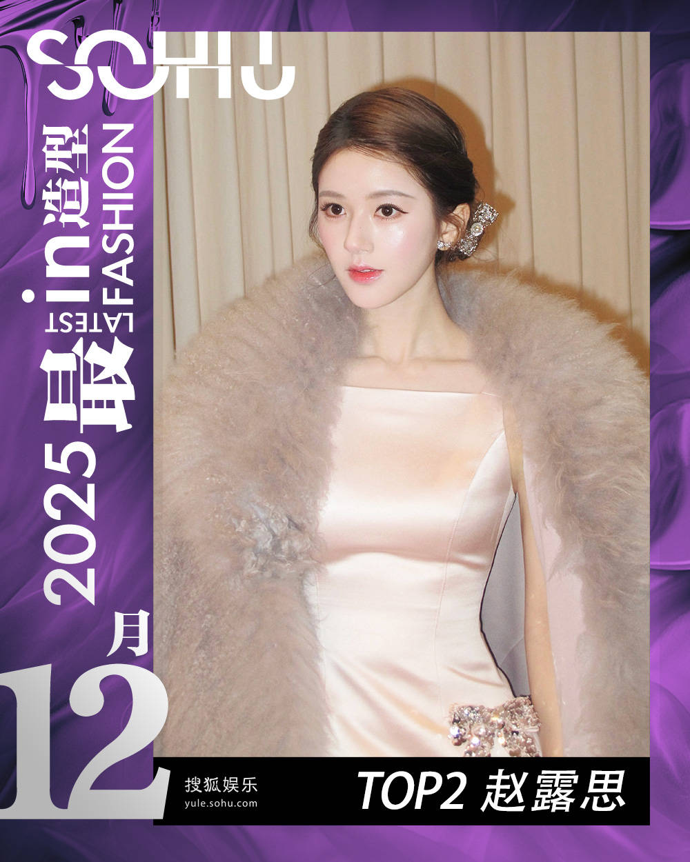 不愧是获得年度最佳造型奖的女星!赵露思的皮草套装,又一次展现出她聚焦目光C位的野心和实力。绸缎小礼裙自带光晕,素净的颜色奶呼呼的,渲染得她肌肤是那样白嫩。优越的锁骨,夸张到几乎和一字领平行,而腰部两个深C,花瓶般的身材就被轻松勾勒出来。Oversize的皮草外套,毛量多到爆炸,淡淡的咖色让人一眼生出倦意,仿佛给大脑做了一场SPA。肥大的衣领柔和地垂落,贴合身形却愈发衬得她娇小纤细。偶尔露出的细长天鹅颈,更是于软糯中暗藏的恰到好处的性感。两只亮片蝴蝶结,随着光影忽闪,散发出温柔的小女人气息,配上精致的低盘发,真让她有了《许我耀眼》里“许妍”的既视感。