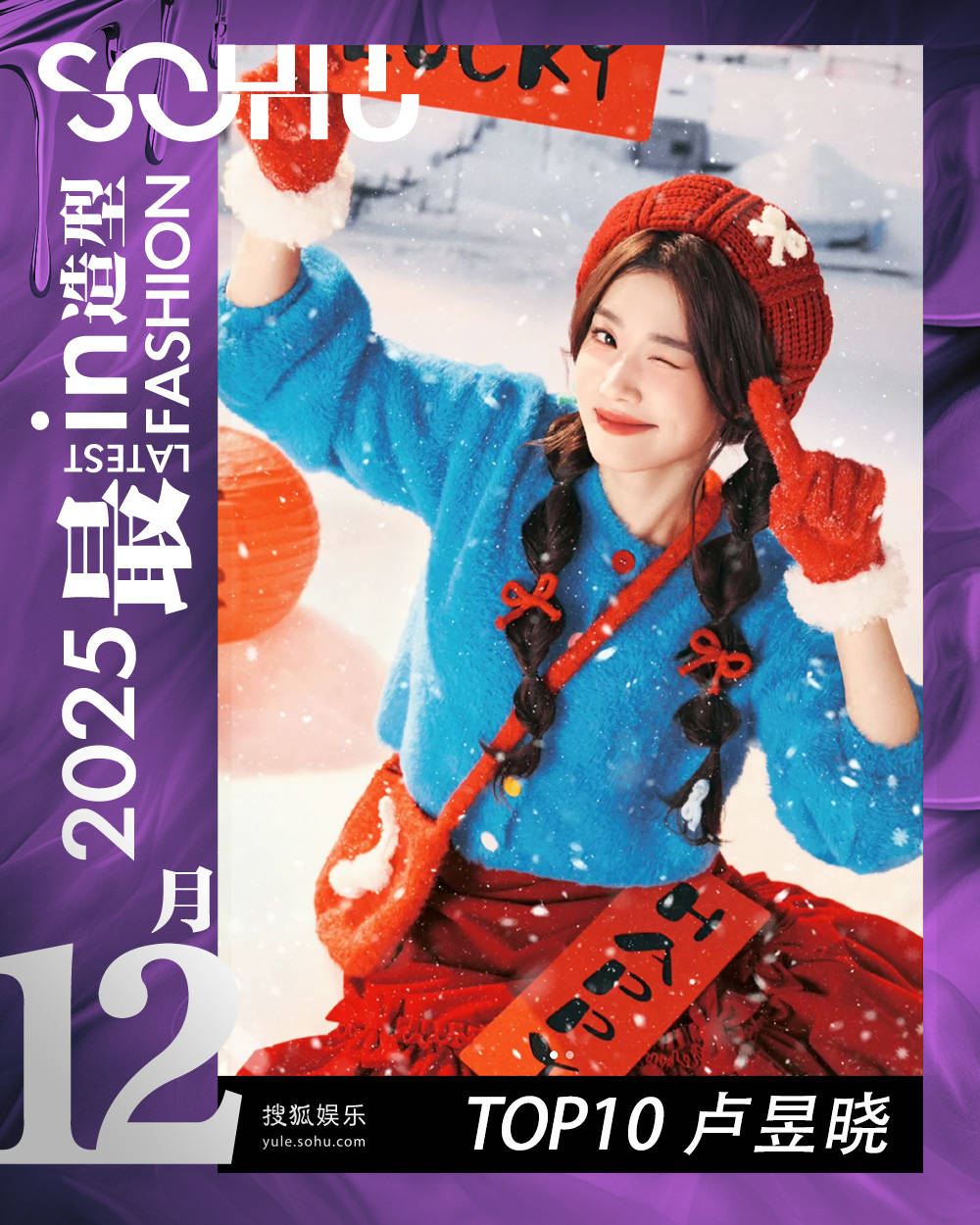 卢昱晓是打翻了上帝的调色盘吧,全身释放着多巴胺因子,就像小糖豆一样,打破了沉闷的冬日。克莱因蓝的毛绒卫衣,提炼出最纯粹的天空颜色,映得积雪都亮了几分。安克拉红的针织手套、贝雷帽,好像也自带快乐情绪,和下身俏皮的公主裙呼应,又亮眼又应景。再有几只蝴蝶结点缀在帽檐和发间,也是别有元气。蹲在雪地里,卢昱晓举着“LUCKY”牌子wink,定格了冬日绘本最生动的一页。