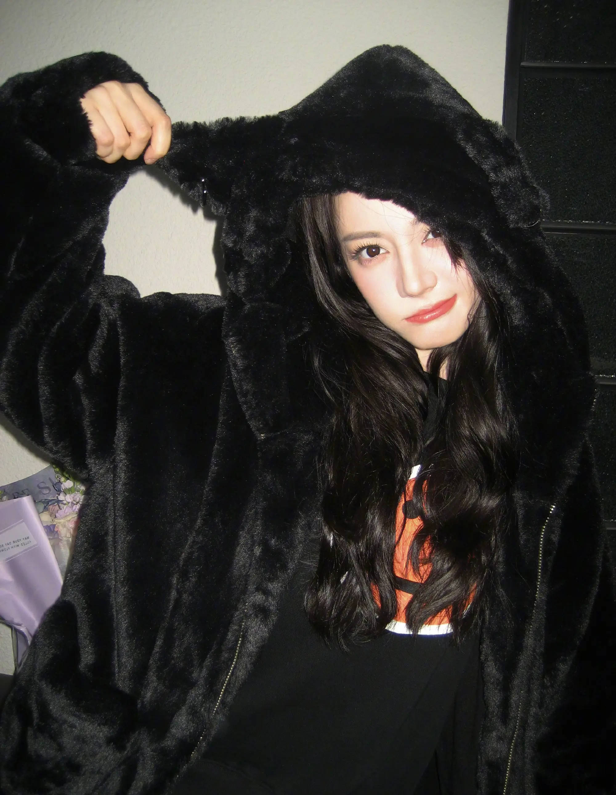 热巴的冬日限定也已就位。黑色连帽外套,软糯又高级,毛嘟嘟的反着光泽,竟可以与丝绒的贵气相媲美,一出场就是“暖意暴击”。内搭一件印花logo卫衣,橙红色图案冲撞出嘻哈街头感,与沉厚的外套形成鲜明对比,多了一份酷帅的呈现。她一边揪着外套上的小熊耳朵,一边凹造型,率性中藏着的clean girl的风格反差。