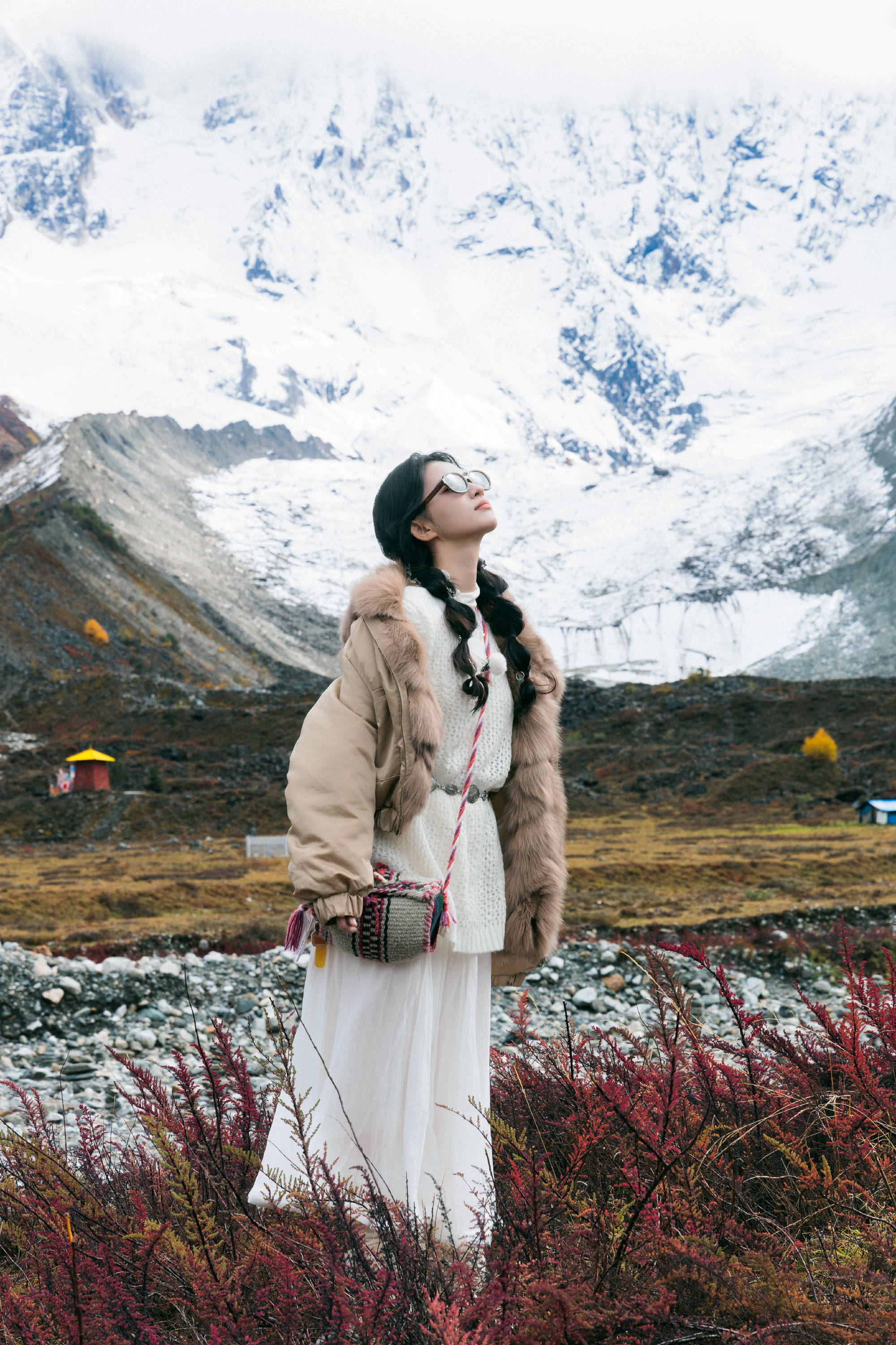 王楚然的cozy风旅行抓拍,是谁又狠狠心动了。扎着泡泡双马尾,她站在雪山脚下仰头凝望,仿佛聆听天地的低语。米色皮草夹克暖和又舒适,保护着她娇小却倔强身躯。绵柔织就的白色毛衣,与轻盈纱裙随风轻轻涌动,伪装成落在山谷间的云朵。民族风针织斜挎包、波西米亚金属腰带,细节里藏着来自旷野的诗意。红枝与雪峰交相辉映,她站在自然中央,不是闯入者,而是这片风景的一部分。