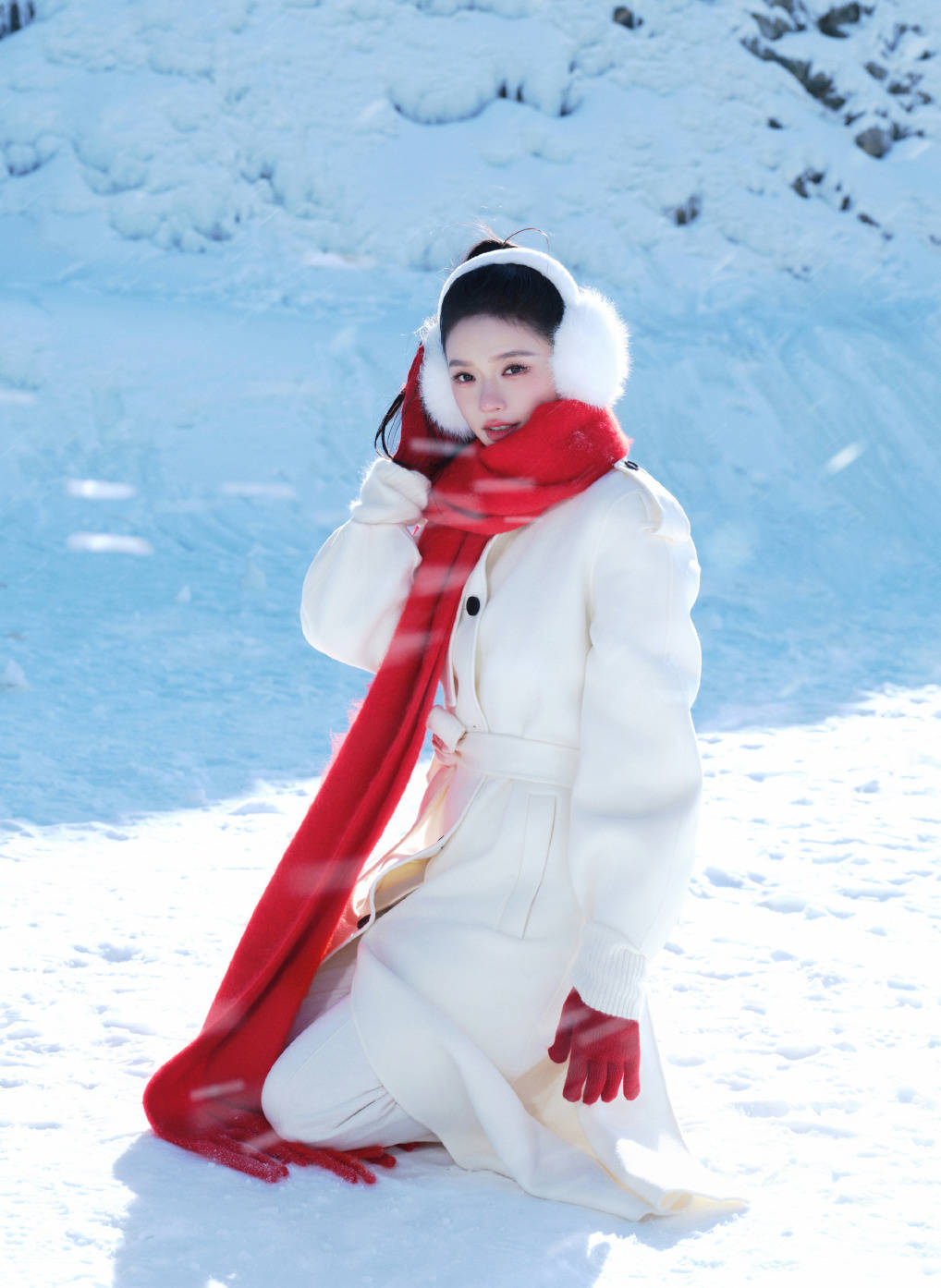 林允跪坐在雪地里,时间也放慢了脚步。腿下吱吱的轻响,诉说冬日写给她的情书,清脆却又能直抵心底。绒绒的耳罩戴在巴掌大的小脸上。一袭纯白毛呢大衣,包裹着全身,净如初雪。而鲜红围巾,像一道跃动的火苗,猛然点亮了整片银白世界。红与白的碰撞,浪漫浑然天成,不知触达了多少人记忆深处的小确幸。