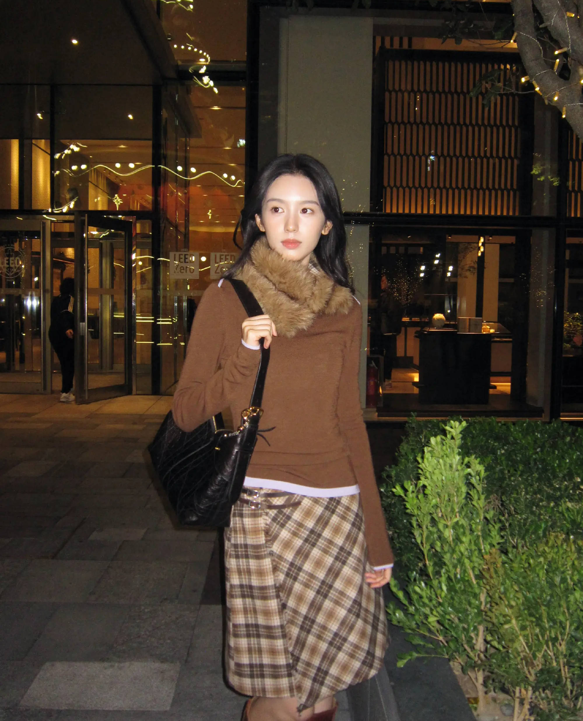 周也的暖冬穿搭,像一杯刚煮好的热可可,温润又治愈。清水般素净的妆容,不争不抢,却自带清冷气质,邻家女孩的亲近感溢出屏幕。棕色针织衫贴合身形,搭配经典的格纹半裙,复古又乖巧。毛绒围脖呵护着脖颈,把整个秋冬的暖意都拢在怀里。脚穿同色系长靴,背上黑色托特包,她变身韩系少女,步伐轻盈地走在夜色里。