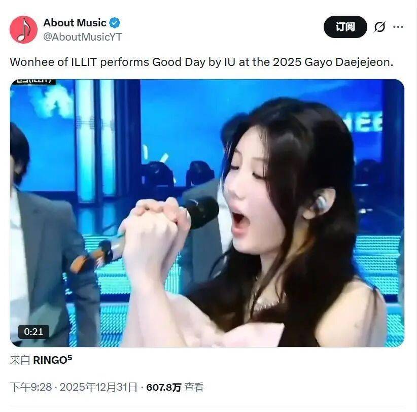 韩国时间12月31日,在《2025 MBC歌谣大祭典》的舞台上,新人女团ILLIT的成员李沅禧(WONHEE)独自站上舞台,挑战了国民歌手IU的经典高难度曲目《好日子》。这场表演犹如一颗投入平静湖面的石子,瞬间在韩网乃至国际粉丝社区激起了千层浪。