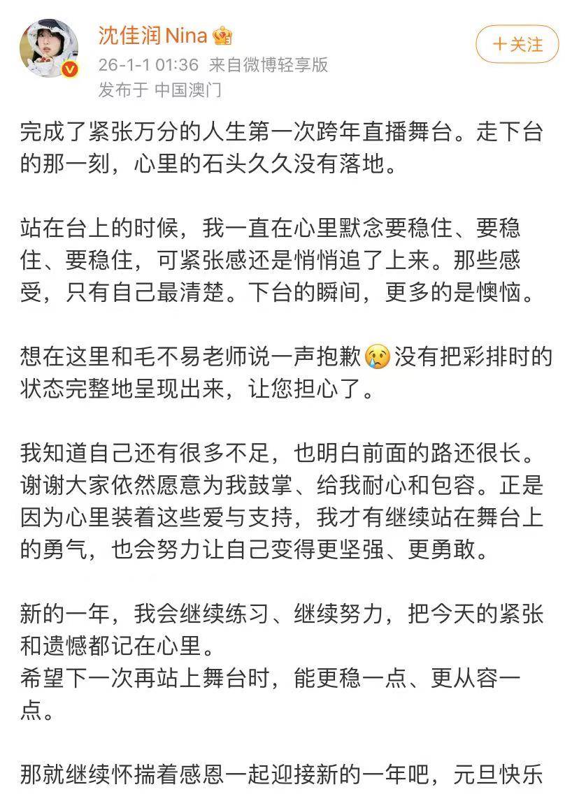 沈佳润向毛不易道歉,其实也是向所有观众道歉,表示她第一次登上跨年的舞台很紧张,站在台上告诉自己要稳住,结果发挥还是失常,不如彩排的时候,其实这件事说明了江苏卫视的跨年演出都是全开麦,是真唱,有瑕疵也可以理解,毕竟才20岁,没有太多表演经验。