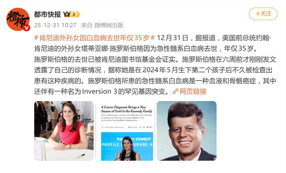 美国前总统约翰·肯尼迪家族那本写满悲剧的史册,在2025年的尾声又被沉重地翻过一页。年仅35岁的环境记者、肯尼迪外孙女塔蒂亚娜·施洛斯伯格,在与一种罕见型急性髓系白血病抗争19个月后,于12月30日去世。消息一出,全网哗然,不仅因为生命的骤然消逝,更因这个家族仿佛挥之不去的“厄运光环”再次被残酷印证。