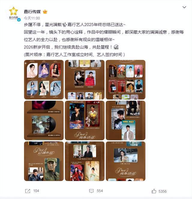 嘉行传媒在2026年元旦发布的年终总结中,因艺人照片排序规则引发网友对迪丽热巴是否续约的猜测,但实际排序规则为常规操作,与迪丽热巴的解约传闻无直接关联。嘉行传媒发布的202