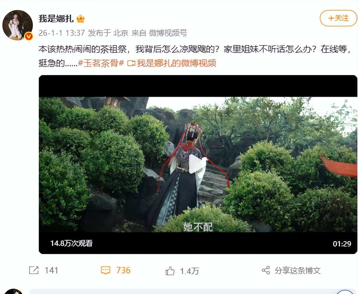 2026年1月1日,娜扎使用剧中角色名“大姐荣善宝”发布微博:“本该热热闹闹的茶祖祭,我背后怎么凉飕飕的?家里姐妹不听话怎么办?在线等,挺急的……”,巧妙呼应剧中家族掌权者人设,并隐含剧情冲突点。