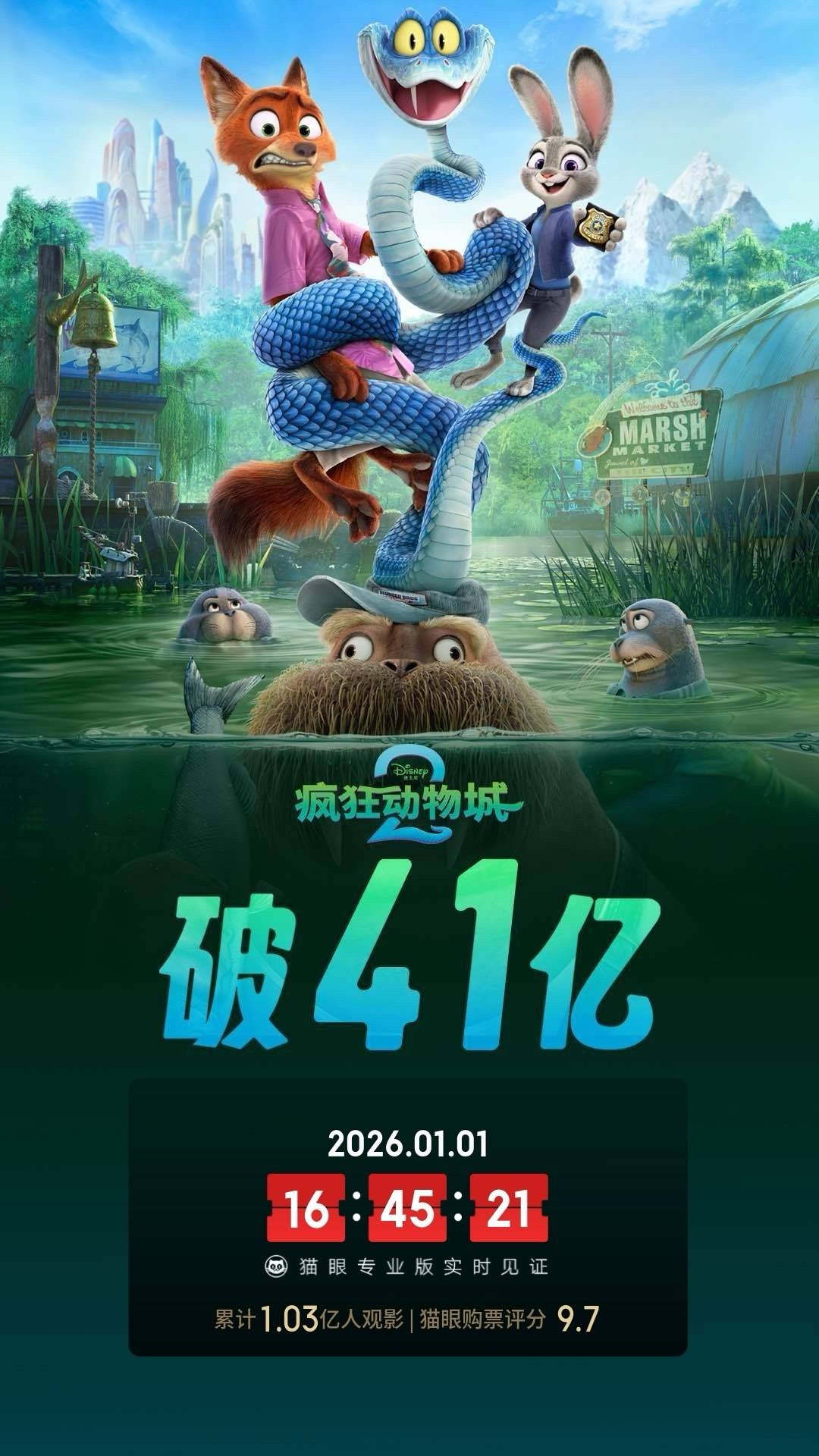据猫眼专业版数据,截至16时45分,电影《疯狂动物城2》上映37天, 总票房破41亿!