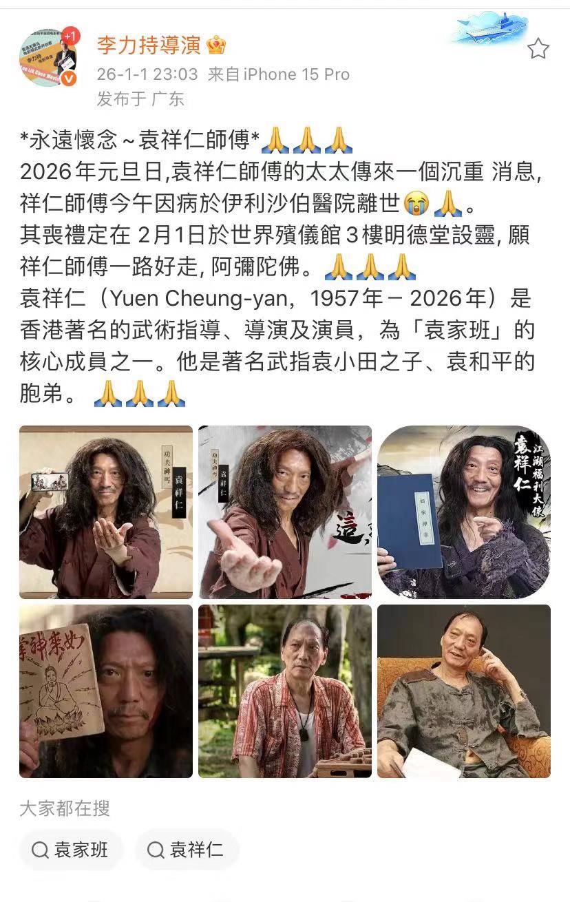 李力持导演发文表示元旦第一天就听到不幸的消息,袁祥仁师傅的太太告诉他一个不幸的消息,袁祥仁在2026年的第一天中午去世,其丧礼定在2月1日于世界殡仪馆3楼明德堂设灵,愿袁祥仁师傅一路好走。