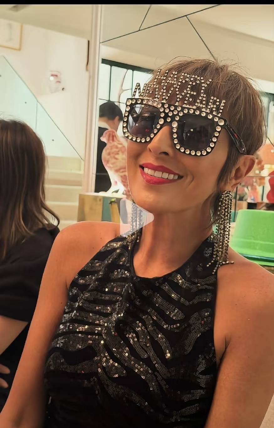 好朋友上山诗纳自然不会缺席,她穿着黑色亮闪闪的挂壁礼服,戴着镶钻的黑色墨镜,上面还有Happy new year的字样,与流苏耳坠形成呼应,美得明媚大气。短发姐姐真的超有气质。