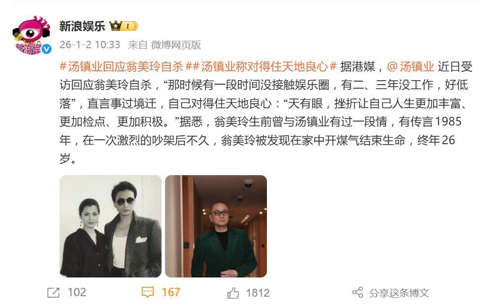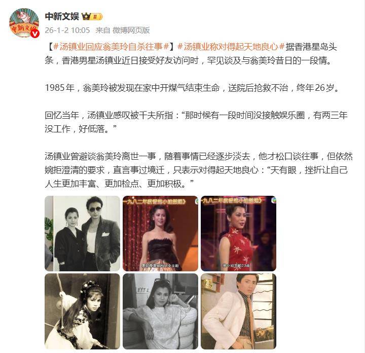 据1月2日报道,近日,香港男星汤镇业在一段好友访谈中,罕见地正面回应了与已故女星翁美玲的昔日恋情及其自杀悲剧。一句“对得住天地良心”的剖白,瞬间将这段尘封近四