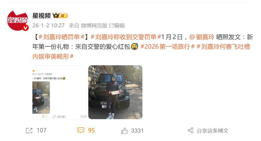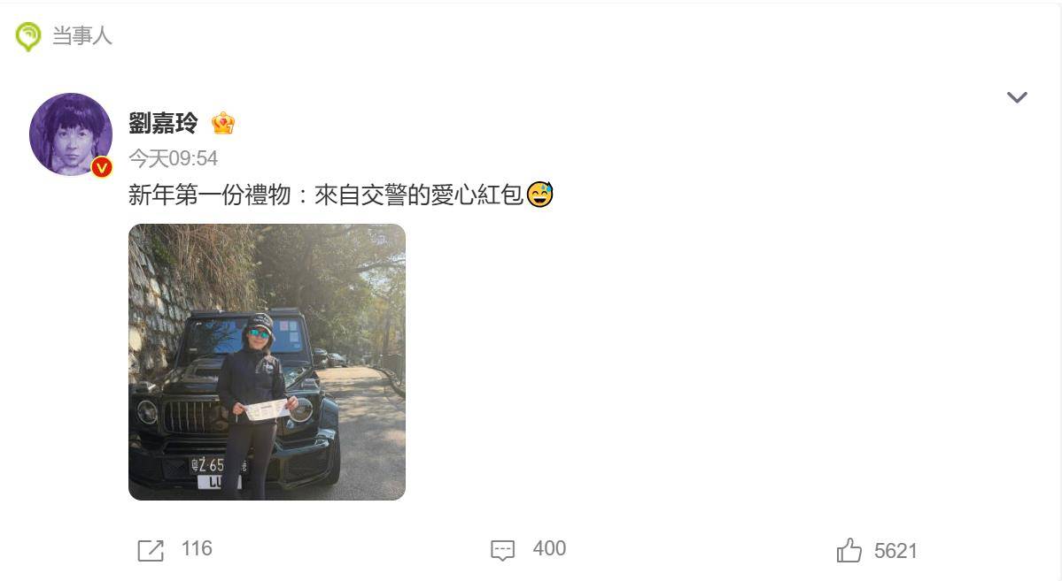 1月2日,刘嘉玲在个人社交平台晒出一张交警罚单,配文轻松调侃:“新年第一份礼物,来自交警的爱心红包。”这张罚单是她驾驶奔驰轿车在上海违规停车所致,但字里行间不见