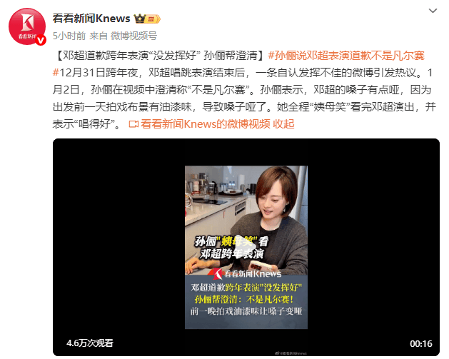 (来源:看看新闻Knews)12月31日跨年夜,邓超唱跳表演结束后,一条自认发挥不佳的微博引发热议。1月2日,孙俪在视频中澄清称“不是凡尔赛”。孙俪表示,邓超的嗓子有点哑,因为