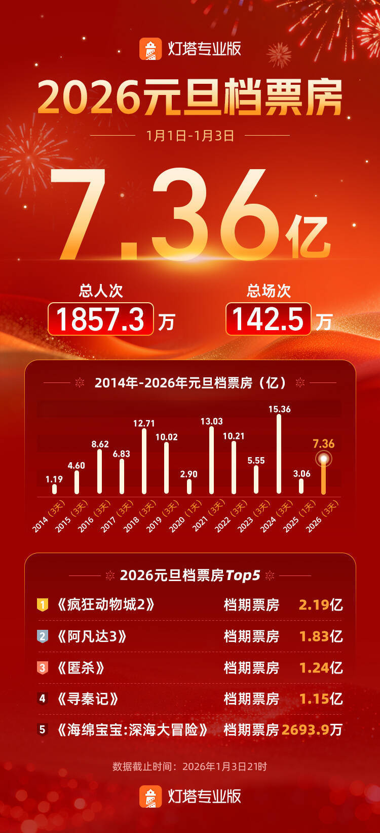 据灯塔专业版,截至1月3日21时,2026年元旦档(1月1日-1月3日)票房7.36亿,《疯狂动物城2》获得2026元旦档票房冠军,并即将超越《复仇者联盟4:终局之战》登顶中国影史进口片冠军榜。