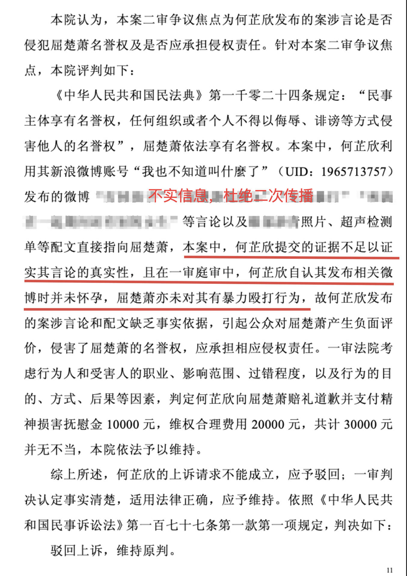 屈楚萧方表示:“今时今日,无关人士反复利用该事持续造谣,意图吸引公众目光,持续编造莫须有的谣言。我方不得已,将该案判决书中的判决内容予以公开,也再次敦促相关人士尽快履行法院判决,早日公开道歉。对于今日莫须有的种种谣言,我方与律师团队均持续进行了取证工作,并将进一步维护艺人的合法权益。望谣言止于智者。”