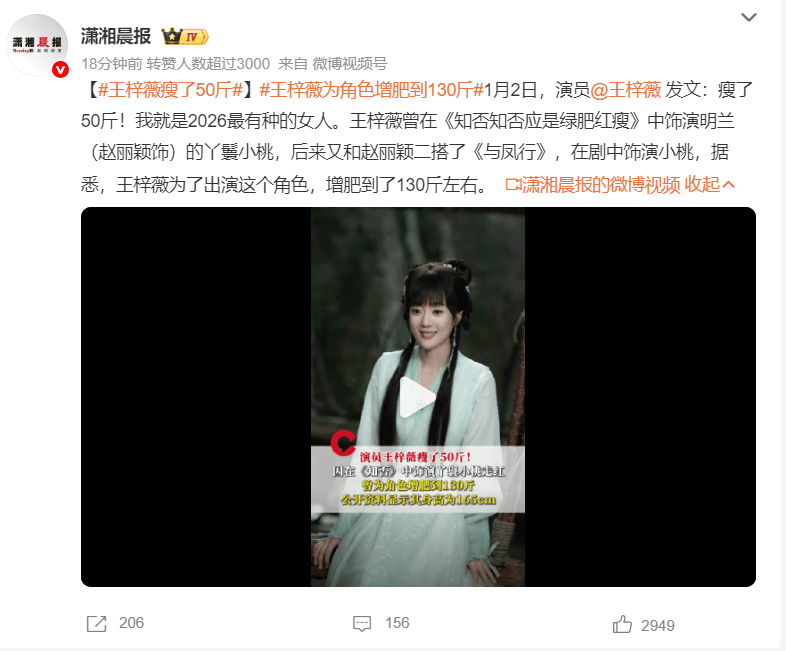 (来源:潇湘晨报)1月2日,演员王梓薇发文称自己瘦了50斤!并直言自己是2026最有种的女人。王梓薇曾在《知否知否应是绿肥红瘦》中饰演明兰(赵丽颖饰)的丫鬟小桃,后来又和赵丽颖二搭了