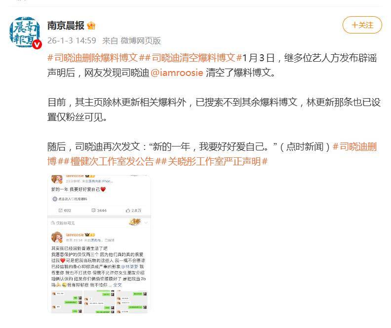 新年伊始,娱乐圈就上演了一出让人瞠目结舌的“开年大戏”。1月3日,在引发全网地震后,爆料人司晓迪(微博账号@iamroosie)突然清空了所有涉及鹿晗、林更新、范丞丞等十余名男艺人的争议博文,只留下一句“新的一年,我要好好爱自己”。这波急转弯操作,直接把围观网友给看懵了。