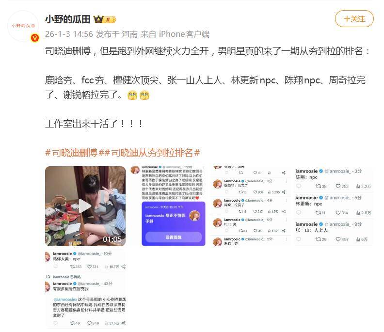 事件始于1月2日深夜至3日凌晨的“信息轰炸”。司晓迪当时密集发文,声称与多位顶流男星存在亲密关系,不仅晒出疑似鹿晗的纹身卫衣照、林更新的私聊记录等“证据”,更放出“30岁前睡遍所有顶流”的惊人言论,瞬间点燃舆论。