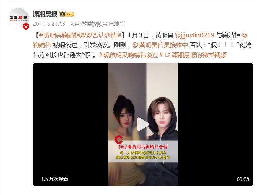 2026年刚开年,娱乐圈的“恋情瓜”就带着一股熟悉的配方味来了。1月3日,知名狗仔“阳阳”一记猛料,声称黄明昊与鞠婧祎“曾恋爱”,细节更是绘声