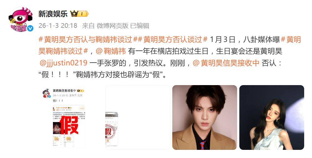 然而,这瓜还没等网友细品,就迎来了堪称“史上最快”的翻转。黄明昊工作室官方账号“黄明昊信昊接收中”直接甩出一个字——“假!!!”,三个感叹号砸得掷地有声。几乎同步,鞠婧祎方的对接账号“橘子传递员”也火速跟上,将传闻定性为“无稽之谈”,并特别强调所谓“生日宴”等细节纯属捏造。从爆料发酵到双方联手“光速打脸”,全程不过数小时,这回应速度被网友戏称为“辟谣界的闪电战”。